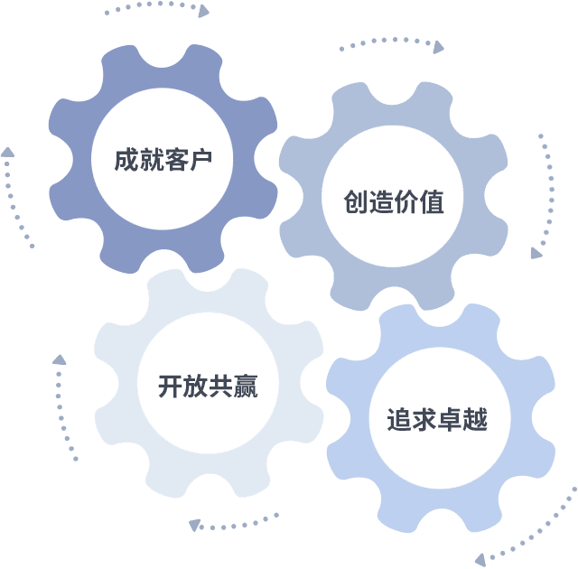成就客户是一切决策的出发点,,创造价值是衡量所有工作的标准,,,,追求卓越是我们做事做人的态度,,,,开放共赢是我们的格局也是最终的结果。。。。价值观的齿轮环环相扣,,,推动着组织里的每个人不断向前。。。