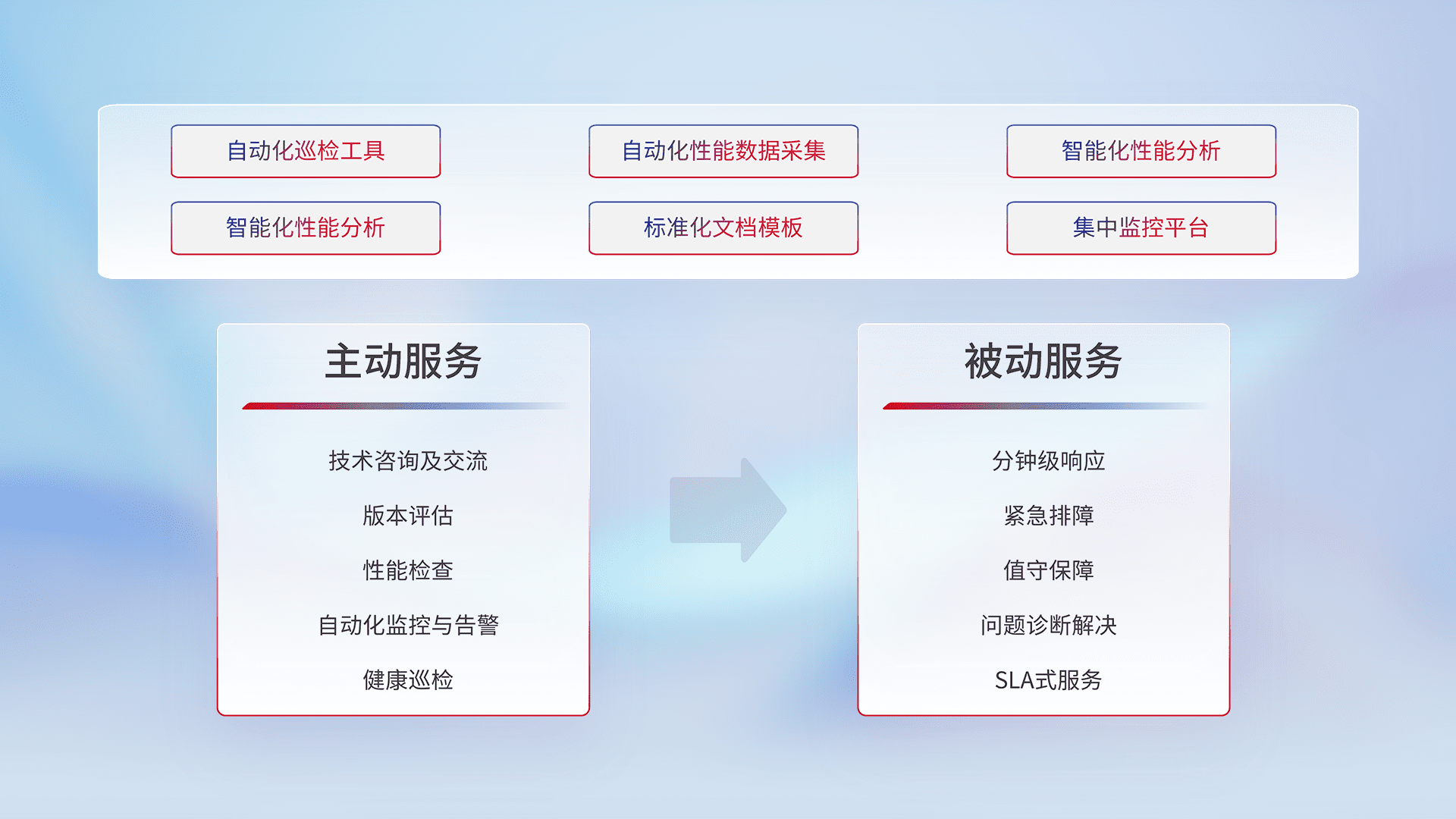 智能化工具和标准化文档,,,,保障服务质量,,提供主动服务(包含技术咨询、、、版本评估、、、性能检查、、、自动化监控与告警、、、、健康巡检)和被动服务包含(分钟级响应、、、、紧急排障、、、值守保障、、、、问题诊断解决、、SLA服务)。。。